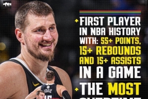 本場(chǎng),約基奇出戰(zhàn)43分鐘,投籃21中15,三分6中4,罰球23中22,砍下56分16籃板15助攻2蓋帽,正負(fù)值+15!