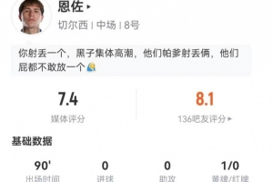 全文摘要:切爾西英超1-2遭維拉逆轉(zhuǎn),中場恩佐首發(fā)踢滿全場。他90.7%傳球成功率亮眼,但2次射門均未命中,對抗成功率低。最終球隊(duì)失利,恩佐獲評7.4分。