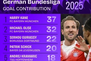 體育資訊12月30日訊 2025年即將結(jié)束,squawka也統(tǒng)計了本年度德甲直接參與進(jìn)球榜,凱恩和奧利塞均參與了至少30球。