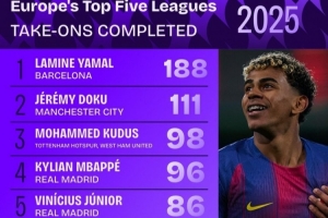 體育資訊12月31日訊 2025年即將結(jié)束,squawka也統(tǒng)計了本年度成功過人情況,亞馬爾斷崖領(lǐng)跑。