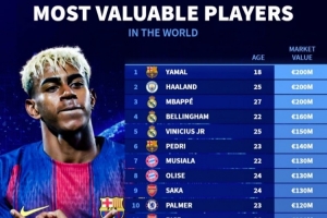 全文摘要:《轉(zhuǎn)會(huì)市場》公布2025年全球球員身價(jià)榜,亞馬爾、哈蘭德和姆巴佩以2億歐并列最高。榜單中皇馬球員最多,巴薩、曼城、巴黎等豪門新星云集,整體呈年輕化趨勢,反映了足壇新生力量的崛起。