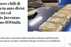 在隨后的搜查中,調(diào)查人員在車輛備胎位置改裝的一個假儲氣罐內(nèi)發(fā)現(xiàn)了9公斤可卡因。引人注目的是,這些被壓制成磚塊狀的毒品上均印有尤文圖斯的標(biāo)志。
