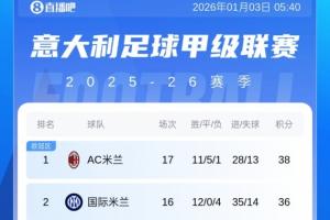 最新的積分榜方面:米蘭先賽2分優(yōu)勢登頂,積36分排名第2的國米1月5日凌晨主場迎戰(zhàn)博洛尼亞,那不勒斯第3、羅馬第4。