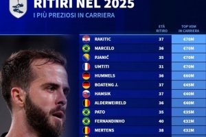 體育資訊1月3日訊 德國轉(zhuǎn)會市場統(tǒng)計了2025年退役球員的歷史最高身價,并列出榜單,拉基蒂奇、馬塞洛、皮亞尼奇、烏姆蒂蒂7000萬歐居首。