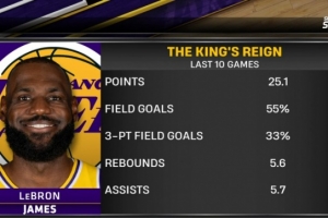 據(jù)比賽轉播商Spectrum SportsNet賽后統(tǒng)計,詹姆斯在最近10場比賽中場均得到25.1分5.6籃板5.7助攻,投籃命中率55%,三分命中率33%。
