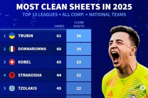 體育資訊1月4日訊 《轉(zhuǎn)會(huì)市場(chǎng)》統(tǒng)計(jì)了2025年前15聯(lián)賽的門(mén)將在俱樂(lè)部+國(guó)家隊(duì)各項(xiàng)賽事總零封場(chǎng)次榜,特魯賓力壓多納魯馬居首。
