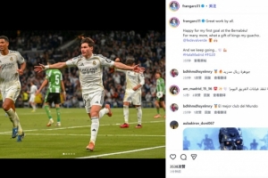 他也在賽后通過社媒曬出自己的慶祝照,并配文:“大家做得太棒了!我很開心收獲自己在伯納烏球場的首球!希望以后還能進(jìn)更多球,這真是份超棒的圣誕禮物,感謝我的朋友@巴爾韋德??????繼續(xù)前進(jìn)…… ??????”