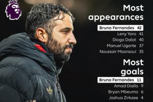 體育資訊01月05日訊 在阿莫林下課后,英超官方曬出了阿莫林執(zhí)教期間,曼聯(lián)球員的各項數(shù)據(jù),B費在出場數(shù)、進球數(shù)、助攻數(shù)上都是最多的。