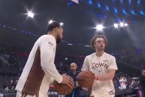 賽前投籃熱身時(shí),庫(kù)里和波杰姆斯基持球相碰,然后再進(jìn)行投籃。