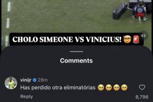 賽后名記羅馬諾在個(gè)人社媒賬號(hào)轉(zhuǎn)發(fā)了這期沖突的現(xiàn)場(chǎng)視頻,而維尼修斯本人也現(xiàn)身評(píng)論區(qū),評(píng)論道:“(西蒙尼)又輸?shù)粢粓?chǎng)淘汰賽?!?/strong>