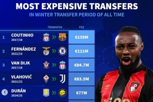 體育資訊1月9日訊 曼城已經(jīng)官宣簽下塞梅尼奧,德轉數(shù)據(jù)統(tǒng)計顯示他也是歷史第7貴的冬窗引援。
