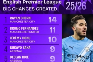 體育資訊1月10日訊 數(shù)據(jù)機構squawka統(tǒng)計了本賽季英超創(chuàng)造重大機會情況,謝爾基力壓B費居首。