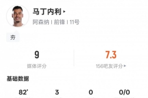 體育資訊1月11日訊 足總杯第3輪,阿森納客戰(zhàn)樸茨茅斯。馬丁內(nèi)利首發(fā)出戰(zhàn),上演帽子戲法,還有1次射中門框,2次錯失進球機會,評分9.0。