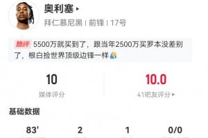 體育資訊1月12日訊 拜仁在本輪德甲7-1領(lǐng)先狼堡,奧利塞本場數(shù)據(jù)如下: