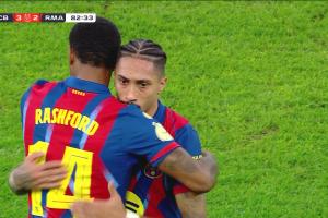 西班牙超級(jí)杯決賽,巴薩3-2擊敗皇馬奪冠。拉什福德第83分鐘換下拉菲尼亞,第95分鐘時(shí)巴薩3-2領(lǐng)先皇馬,拉什福德跑出半場(chǎng)大單刀,慢悠悠錯(cuò)失良機(jī)。轉(zhuǎn)過(guò)頭來(lái)皇馬進(jìn)攻,姆巴佩直塞禁區(qū),居萊爾下底倒三角,卡雷拉斯點(diǎn)球點(diǎn)附近直面球門(mén)的推射被霍安沒(méi)收,巴薩險(xiǎn)些被絕平,拉什福德幾乎全程眼神防守。