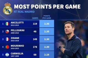 皇馬主帥場均積分排名(至少執(zhí)教30場):