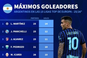 體育資訊1月14日訊 德國轉(zhuǎn)會市場統(tǒng)計了阿根廷球員本賽季在歐洲聯(lián)賽的進(jìn)球數(shù)量,并列出榜單,勞塔羅14球居首。