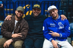體育資訊1月15日訊 杜克大學(xué)官方社媒更新,曬出了庫里父子三人在場(chǎng)邊看球的合照。