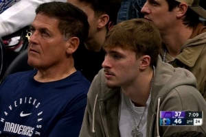 本場(chǎng)比賽因左腳踝扭傷缺戰(zhàn)的弗拉格來(lái)到了現(xiàn)場(chǎng),并坐在球隊(duì)小老板庫(kù)班身邊觀(guān)看比賽。
