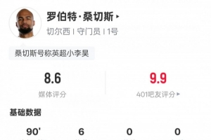 體育資訊1月18日訊 英超第22輪,切爾西2-0布倫特福德。本場比賽,藍軍首發(fā)門將羅伯特·桑切斯表現(xiàn)出色,貢獻全場最多的6次撲救,評分8.6全場最高。