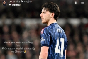 體育資訊1月18日訊 在阿森納客場0-0戰(zhàn)平諾丁漢森林后,賴斯更新了社交媒體。