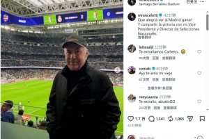 曾兩度執(zhí)教皇馬的現(xiàn)任巴西隊主帥安切洛蒂重返伯納烏,現(xiàn)場觀看了這場比賽,他在社交媒體上曬出照片,配文:“看到皇馬獲勝真是太開心了!而且還能與我的(巴西足協(xié))副主席和國家隊總監(jiān)共同分享勝利的喜悅?!?/p>