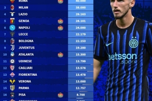 2025-26意甲俱樂部季票銷售排名: