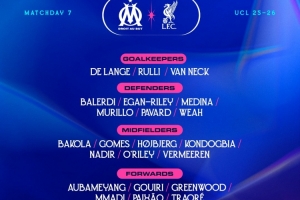 體育資訊1月21日訊 北京時間明天凌晨,馬賽將在歐冠聯(lián)賽階段第7輪比賽中主場對陣利物浦,馬賽公布了此役的球員名單。