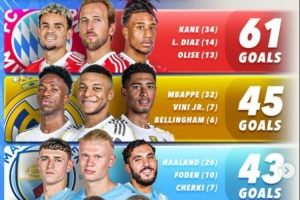 體育資訊1月24日訊 數據網站Score90盤點了本賽季五大聯(lián)賽球隊進攻三叉戟在各項賽事進球榜,具體如下: