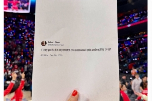 此前,一位網(wǎng)友曾表示,如果快船本賽季能夠在任意階段取得15勝3負(fù),他將打印這條推文并吃掉,這段推文今天被展示在快船的球迷墻。