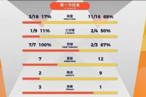 首節(jié)比賽,山東全隊(duì)進(jìn)攻端毫無(wú)狀態(tài),內(nèi)外線(xiàn)都不在線(xiàn),各種打鐵頻出,命中率低到離譜:投籃18投僅3中,三分更是僅9中1。