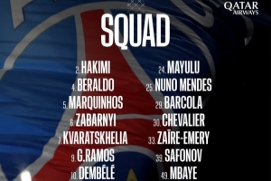 體育資訊1月28日訊 北京時間明天凌晨4點,歐冠聯(lián)賽階段第8輪,巴黎主場對陣紐卡,巴黎公布了此役球隊大名單。