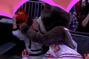 火箭主場迎戰(zhàn)馬刺,暫停是kiss cam環(huán)節(jié),鏡頭給到一位穿著馬刺球衣的球迷和他的女伴,隨后火箭吉祥物火箭熊叫來保安“逮捕”這位球迷,并和他的女伴熱吻。