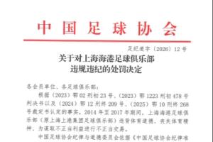 體育資訊01月29日訊 中國(guó)足協(xié)公布足球行業(yè)“假賭黑”處罰決定,上海海港俱樂部被扣5分并罰款40萬(wàn)元。