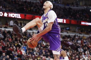 在此前湖人在客場以129-118擊敗公牛的比賽中,海斯曾上演搶斷反擊胯下暴扣的精彩戲碼。