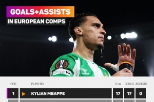 自安東尼于2025年2月1日加盟皇家貝蒂斯以來,在不含預(yù)選賽的歐戰(zhàn)中,僅有姆巴佩(17球)參與的進(jìn)球數(shù)多于安東尼。