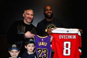 NHL華盛頓首都人隊官推曬出一段本場觀戰(zhàn)的首都人隊球星亞歷克斯·奧維契金賽后與湖人前鋒詹姆斯交換簽名球衣的互動片段。