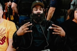 比賽間隙,哈登還和兩位橄欖球隊校友喬丁·泰森(下圖中)、卡梅倫·斯卡特博(下圖左)互動。