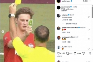 哈維·西蒙斯社媒曬出自己被出示黃牌的照片,以及球員向裁判出示UNO卡牌的梗圖,配文:“UNO說——抽牌(雙關平局)?!?/p>