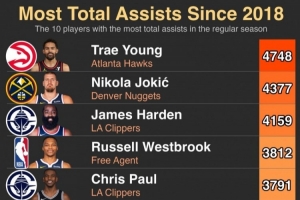 體育資訊9月27日訊 美媒HoopsHype統(tǒng)計(jì),從2018年至今NBA助攻最多的10位球員,其中特雷-楊最多有4748次,而約基奇排名第二有4377次。