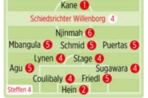 體育資訊9月27日訊 德甲第5輪比賽,拜仁主場4-0擊敗不萊梅,德國媒體《圖片報》為兩隊球員評分,若納坦-塔、凱恩、迪亞斯1分最高。