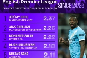 體育資訊2月3日訊 “Squawka”統(tǒng)計(jì)了上賽季開始至今,每90分鐘創(chuàng)造運(yùn)動(dòng)戰(zhàn)機(jī)會(huì)最多的前十位英超球員(只統(tǒng)計(jì)創(chuàng)造50次機(jī)會(huì)以上的球員)。曼城邊鋒多庫以場(chǎng)均2.37次領(lǐng)跑榜單。