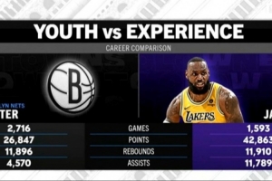 湖人客場挑戰(zhàn)籃網(wǎng),轉(zhuǎn)播方曬出籃網(wǎng)全隊(duì)和詹姆斯的數(shù)據(jù)對比,籃網(wǎng)全隊(duì)的得分、籃板和助攻之和都沒有詹姆斯的個人數(shù)據(jù)多。