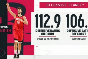 申京在場火箭防守效率(球隊(duì)百回合失分)112.9,下場后為106.1