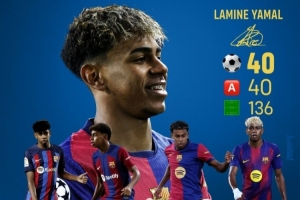 據(jù)《世界體育報》統(tǒng)計,18歲亞馬爾為巴薩出戰(zhàn)136場比賽,已貢獻40粒進球和40次助攻。