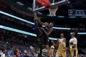 在本場比賽中,阿德巴約在一次進攻中直接隔著隊友韋爾完成了一次石破天驚的補扣。