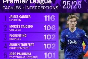 體育資訊2月10日訊 squawka統(tǒng)計(jì)了本賽季英超球員的搶斷+攔截情況,詹姆斯·加納力壓凱塞多居首。