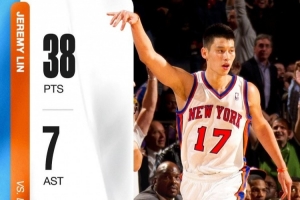 本場(chǎng)比賽,尼克斯以92-85擊敗湖人;林書豪出戰(zhàn)38分34秒,投籃23中13,三分4中2,罰球13中10,得到38分4籃板7助攻2搶斷。
