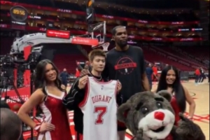 賽前,任嘉倫現(xiàn)身火箭主場(chǎng),為杜蘭特送上唐裝作為禮物,后者送上簽名球衣+合影留念。