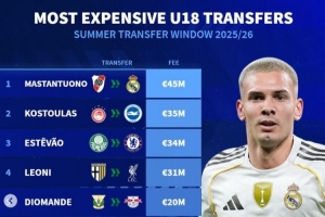 體育資訊9月5日訊 《轉(zhuǎn)會市場》統(tǒng)計了今夏的U18球員最貴轉(zhuǎn)會費(fèi)榜單,皇馬4500萬簽下馬斯坦托諾居首。